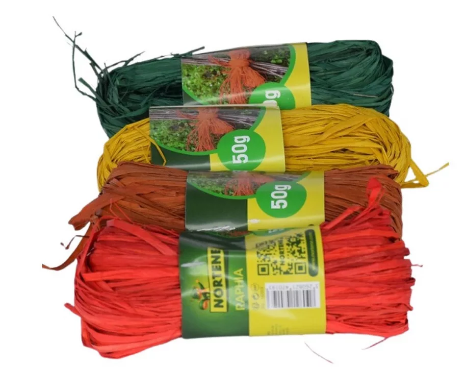 4 csomag 50 grammos természetes anyagú (lebomló) kötözőraffia, zöld, sárga, piros és natúr színben.