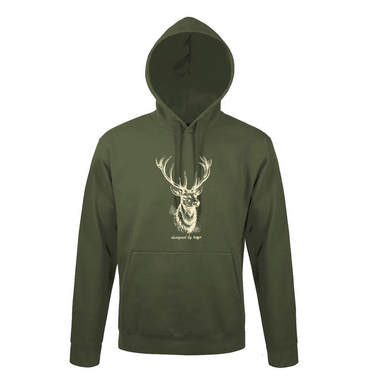Kapucnis pulóver (szarvas mintával) 50% pamut 50% poliészter, military green,